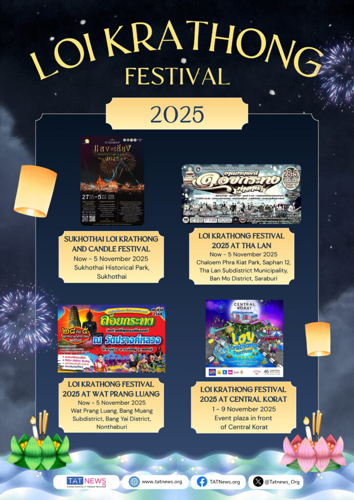 The Sukhothai Loi Krathong and Candle Festival 2025 will proceed as scheduled from October 27 to November 5, 2025, at Sukhothai Historical Park, with activities modified to reflect the national mourning period. A nightly candle-lighting tribute will take place at 21.21 hrs to honour Her Majesty Queen Sirikit, The Queen Mother. Fireworks will feature only traditional Sukhothai-style displays, and the Noppamas beauty contest will be cancelled.